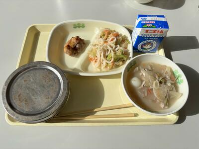【献立:ごはん、牛乳、とり肉の生姜焼き、こめ麺サラダ、果報団子汁】