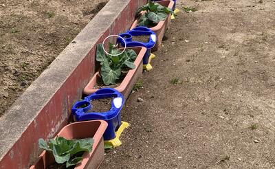 3年理科の学習で「チョウを育てよう」という単元があります。そのため、3年生では、プランターにキャベツを植えて、チョウが卵を産み付けられる環境を準備していました。昨日、校庭巡視中に偶然モンシロチョウが飛んでいたので、様子を伺っていたところ、キャベツの葉の裏側に入り込み卵を複数個産み付ける場面を見ることができました。(子どもたちにも見せたかった…。)この後学習が進み、何匹(何頭)育てられるか、子どもたちの学習が楽しみです。(昆虫学や専門的な文脈では「頭」で数える)※丸で囲んでいるところにモンシロチョウがいます。
