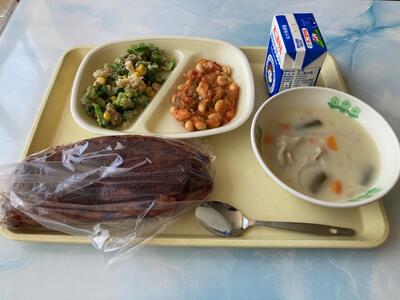 【本日の献立(661kcal):ココアあげパン、豆乳シチュー、鶏肉と大豆のトマト煮込み、花野菜サラダ、牛乳】