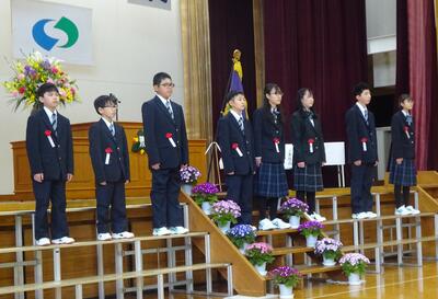 3月19日(水)、第78回卒業証書授与式を行いました。卒業証書を受け取る時の卒業生のまっすぐなまなざし 、凛々しい姿は、とても誇らしく輝いて見えました。式中の旅立ちの言葉では、「学年テーマ『いつでも誰かのために』を掲げ、下級生のため、学校のため、そして友達のため、少しずつ胸に染みた言葉の意味は、私たちの大切な道標になりました」と、最高学年を自覚しその責任を果たした8名の想いが込められ、力強く表現されました。中学校という新たなステージに立っても、力を発揮し続けることと思います。卒業生の益々の成長と活躍を願っています。8名の卒業生のみなさん、「顔晴れ(がんばれ)」!