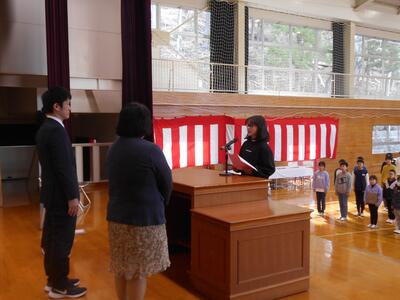 進級した新2~6年生の39名全員が揃いました。はじめに紹介式で3名の先生方を紹介し、続いて始業式で担任の先生との出会いの瞬間… 子どもたちは、担任の先生の名前が発表されるたびに、キラキラした笑顔と温かな拍手で迎えていました。